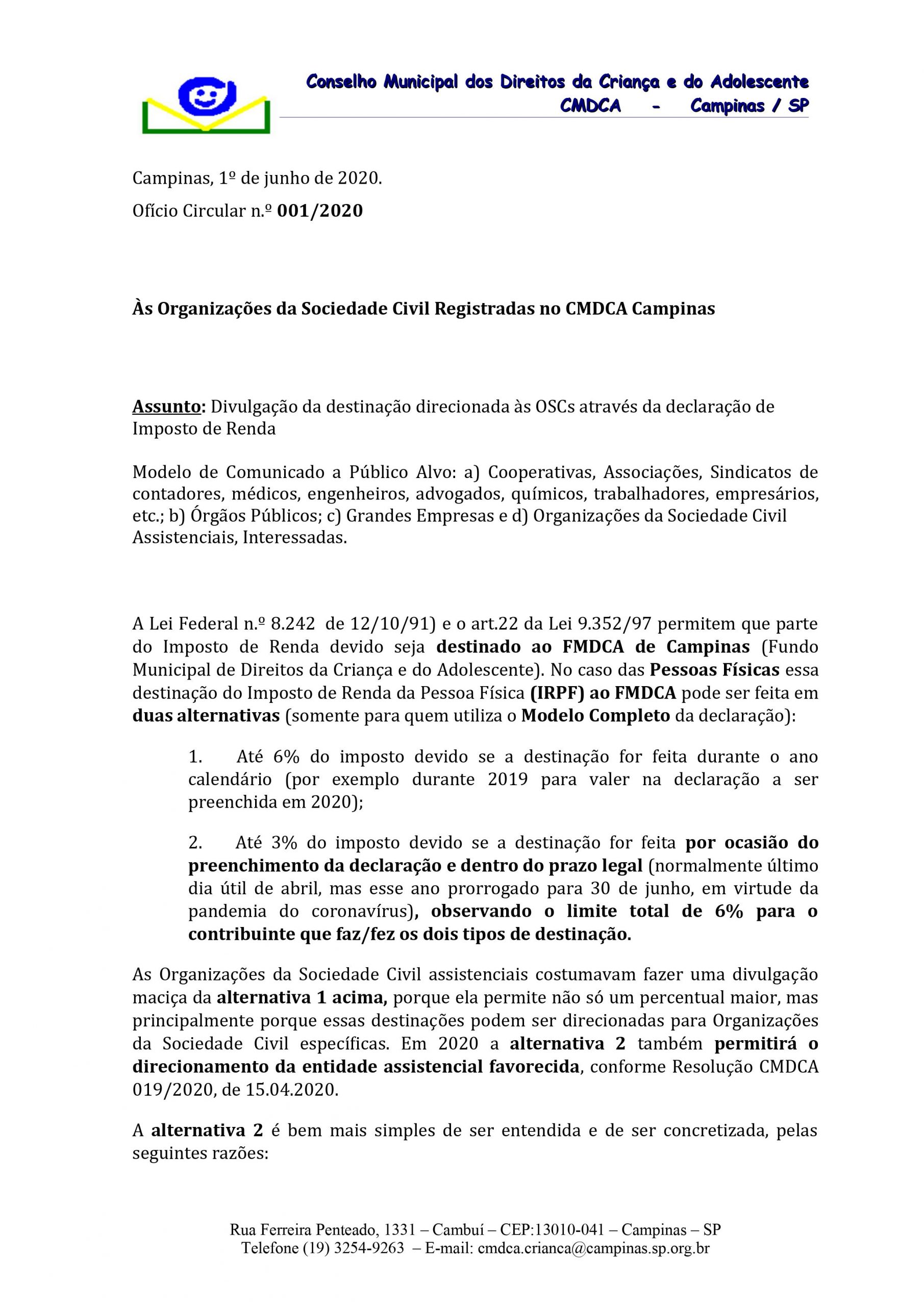 A Lei Federal n.º 8.242 de 12/10/91) e o art.22 da Lei 9.352/97 permitem que parte do Imposto de Renda devido seja destinado ao FMDCA de Campinas (Fundo Municipal de Direitos da Criança e do Adolescente). No caso das Pessoas Físicas essa destinação do Imposto de Renda da Pessoa Física (IRPF) ao FMDCA pode ser feita em duas alternativas (somente para quem utiliza o Modelo Completo da declaração)